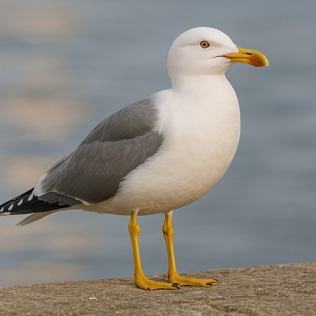A gaivota-de-patas-amarelas destaca-se pelo seu corpo robusto, penas branco-acizentadas e, claro, as suas patas amarelas brilhantes. O bico é amarelo com uma pequena mancha vermelha, que muitas vezes é usada para ajudar a identificar a espécie a partir de outras gaivotas similares. Estas características não apenas a tornam facilmente identificável, mas também a diferenciam de outras espécies de gaivotas.
